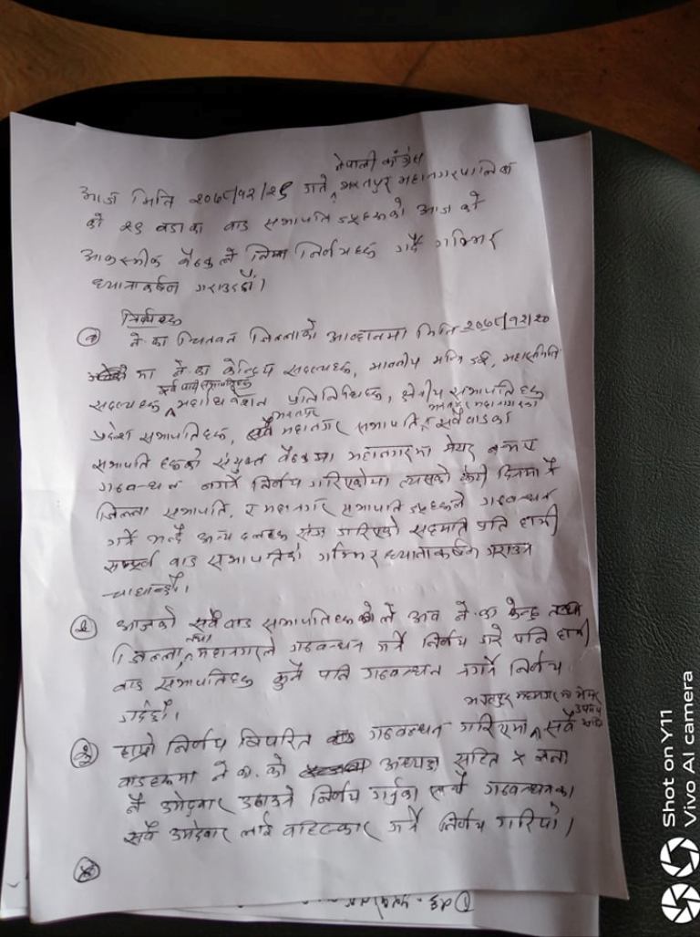 नेपाली कांग्रेस वडा नम्बर १९ का सभापति आसमान तामाङको अध्यक्षतामा मंगलबार जिल्ला पार्टी कार्यालय कमलनगरमा बसेको वडा सभापतिको बैठकले केन्द्रीय निर्णयको विरोध गरेको हो । अनौपचारिक निर्णयअनुसार भएमा मेयर, उपमेयरसहित सबै वडामा स्वतन्त्र उम्मेदवारी दिने निर्णय गरेका छन् ।