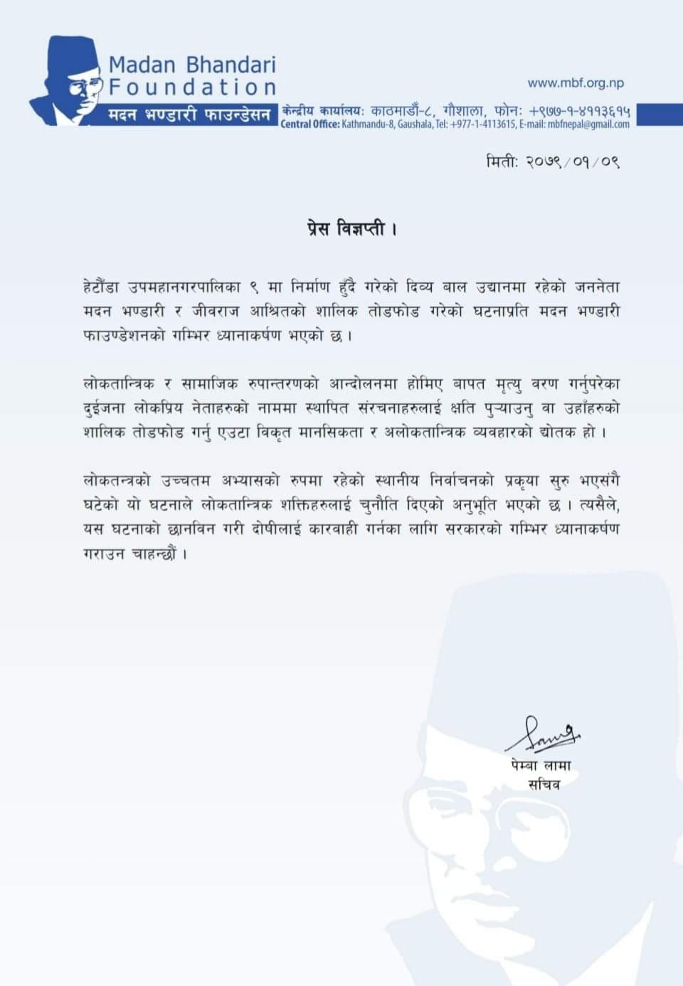 हेटौंडा उपमहानगरपालिका–९ मा निर्माण हुँदै गरेको दिव्य बाल उद्यानमा रहेको मदन भण्डारी र जीवराज आश्रितको शालिक तोडफोड गरेको घटनाप्रति आफ्नो गम्भीर ध्यानाकर्षण भएको भन्दै फाउण्डेसनले तोडफोडमा संलग्नलाई कारबाही पनि गर्न माग गरेको छ ।