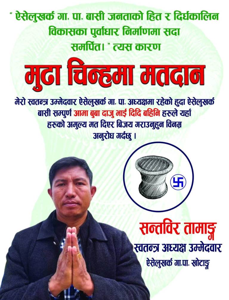 ऐंसेलुखर्क गाउँपालिकामा गठबन्धन दलका तर्फबाट अध्यक्षमा नेकपा माओवादी केन्द्रका श्रीबहादुर राई र उपाध्यक्षमा कांग्रेसका राजेश राजभण्डारीलाई उम्मेदवार बनाएको अवस्थामा तामाङले स्वतन्त्र उम्मेदवारी दिएका हुन् ।