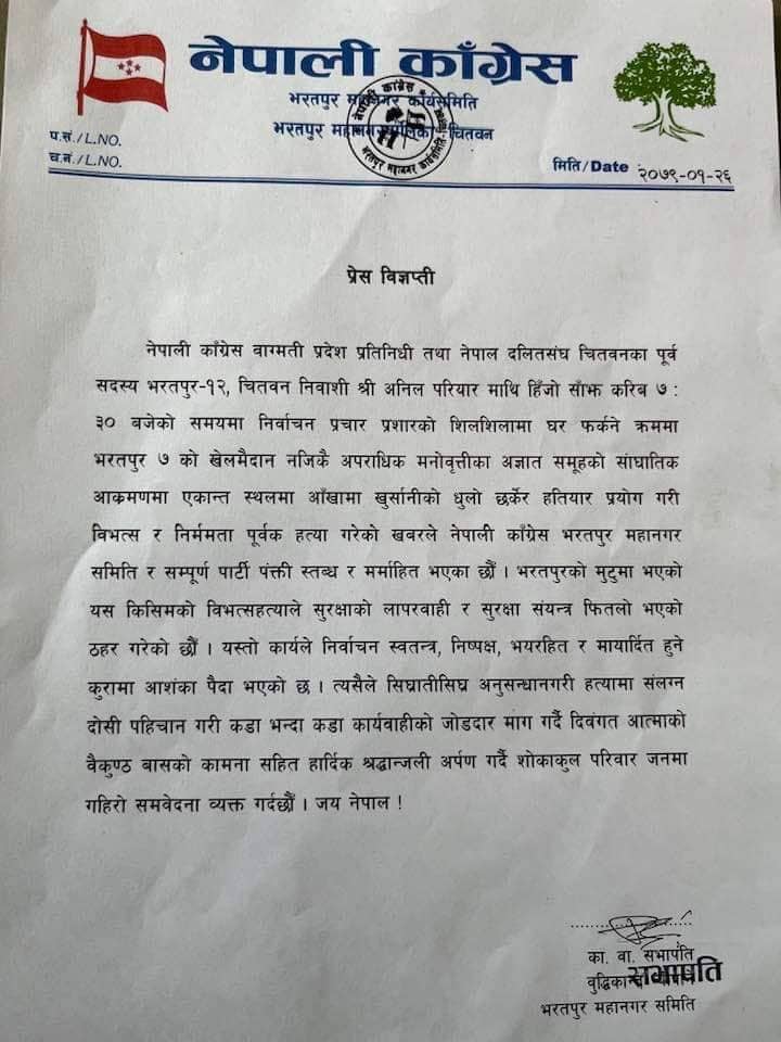 ‘निर्वाचनको प्रचारप्रसारको सिलसिलामा खटिरहेका एक युवा व्यक्तित्व माथी सुनियोजित तरिकाले साङ्घातिक आक्रमण गरि निर्मम तरिकाले हत्या भएको घटनाले नेपाली कांग्रेस चितवनलाई स्तब्ध एवम् मर्माहित तुल्याएको छ । उक्त घटनाप्रति नेपाली कांग्रेस चितवन खेद प्रकट गर्दै यस घटनाको यथाशीघ्र सत्यतथ्य पत्ता लगाई दोषीमाथी कडाभन्दा कडा सजाय गर्न सम्बन्धित निकायसँग जोडदार माग गर्दछौ । अन्यथा यस घटनाबाट सिर्जना हुने सम्पूर्ण परिस्थितिको जिम्मेवार स्वयम प्रशासन हुने छ,’ जारी विज्ञप्तिमा भनिएको छ, ‘दिवंगत आत्माप्रति चिरशान्तिको कामना एवम् भावपूर्ण श्रद्धाञ्जली व्यक्त गर्दै शोक सन्तव्ध परिवारजनमा गहिरो समवेदन ब्यक्त गर्दछौं ।’
