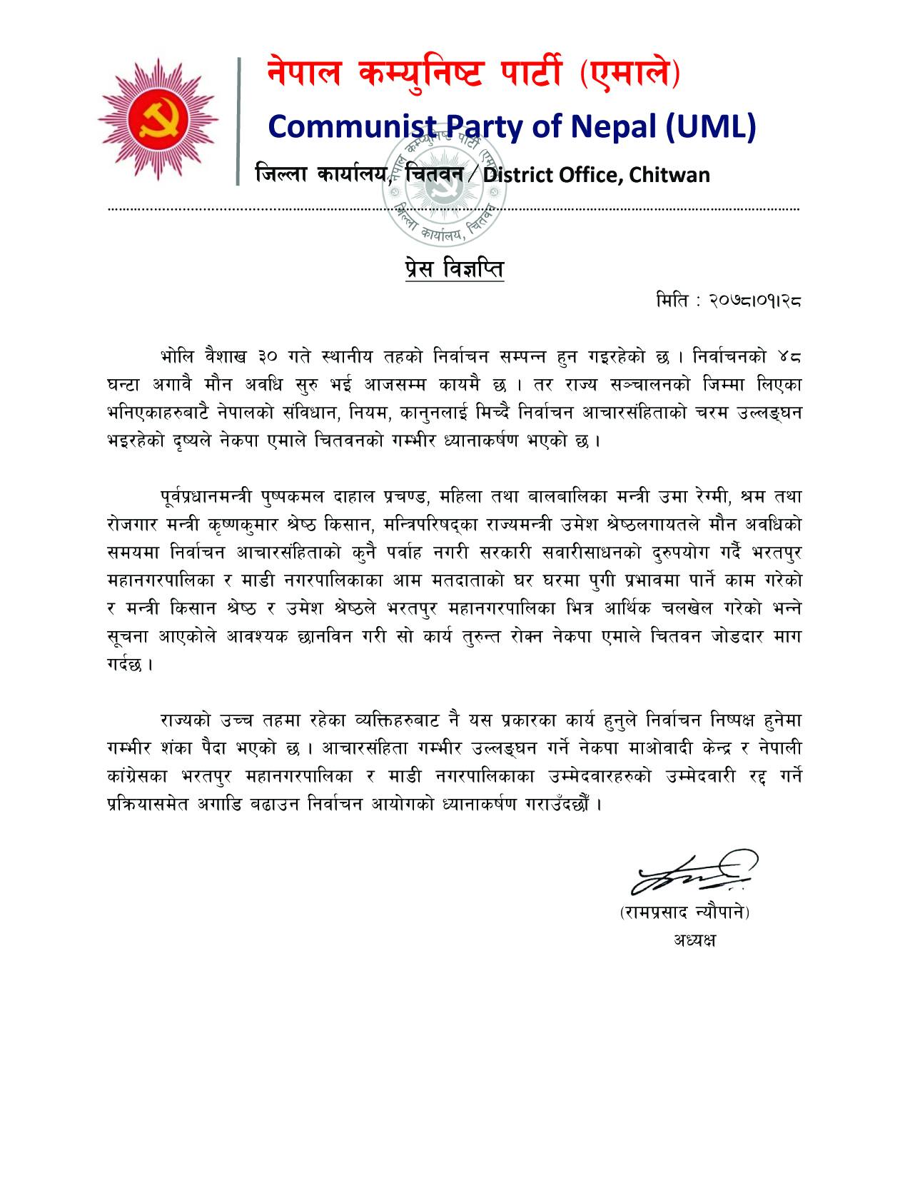 एमाले चितवनका अध्यक्ष रामप्रसाद न्यौपानेले हस्ताक्षर गरेको विज्ञप्तिमा राज्य पक्षबाट भएको यस्ता कार्यले निर्वाचन निष्पक्ष हुनेमा शंका उत्पन्न भएको बताइएको छ । आचारसंहिताको गम्भीर उल्लंघन गर्ने माओवादी केन्द्र र कांग्रेसका भरतपुर र माडीका उम्मेदवारको उम्मेदवारी रद्द गर्नसमेत उनले माग गरेका छन् ।