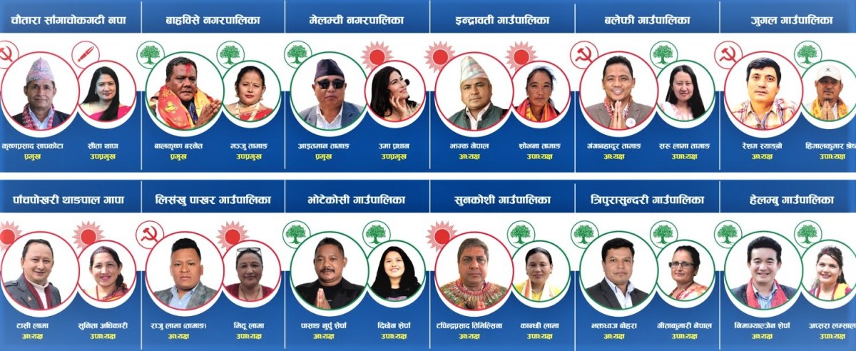 संखु प्रमुख माओवादीले जित्दा उपप्रमुख भने एमालेबाट मिठुदेवी लामा निर्वाचित भइन् । सुनकोसीमा एमालेका टपेन्द्र तिमल्सिनाले अध्यक्ष पद जित्दा उपाध्यक्षमा कांग्रेसकी कान्छी लामाले जितिन् । बलेफीमा माओवादीले अध्यक्ष आफ्नो पोल्टामा पाउँदा उपप्रमुखमा कांग्रेसकी सरु लामा तामाङ निर्वाचित भइन् । मेलम्चीमा कांग्रेसका आइतमान तामाङ प्रमुख पदमा विजयी हुँदा उमा प्रधान एमालेबाट निर्वाचित भइन् ।