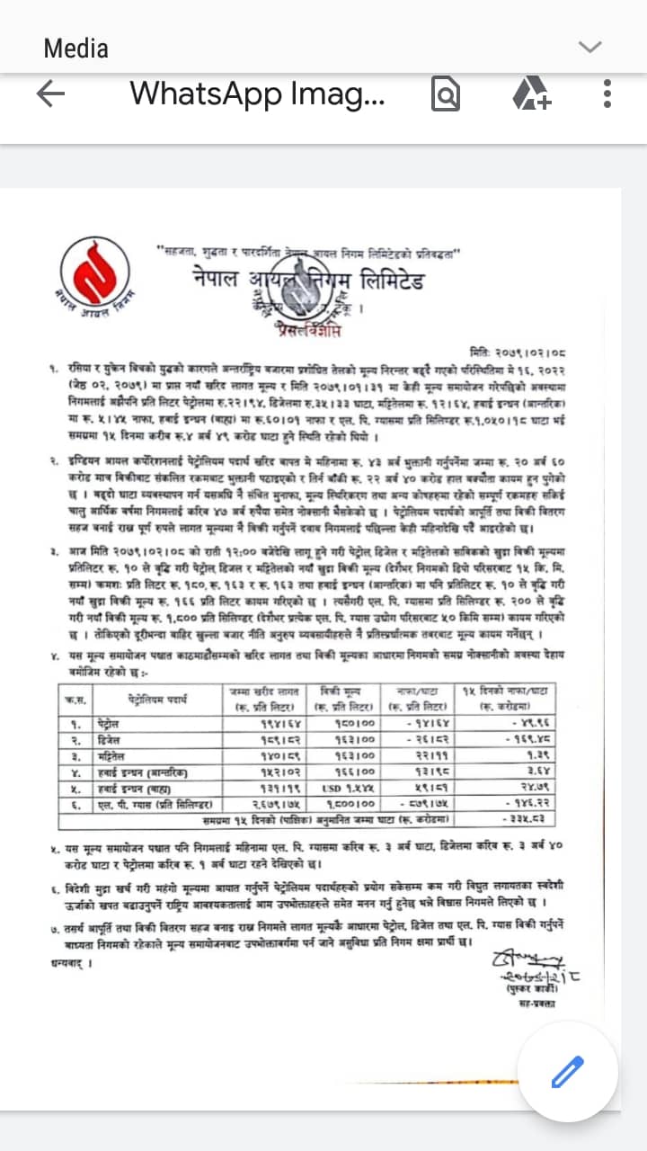 निगमले पेट्रोल, डिजेल र मट्टितेल प्रतिलिटर १० रुपैयाँका दरले बढाउँदा खाना पकाउने ग्याँसको मूल्य प्रतिसिलिण्डर २ सय रुपैयाँ बढाएको छ ।
