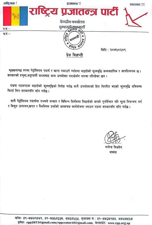 काठमाडौं । राष्ट्रिय प्रजातन्त्र पार्टी (राप्रपा) ले पेट्रोलियम पदार्थमा लगाइएको करमा पुनर्विचार गर्न आग्रह गरेको छ ।