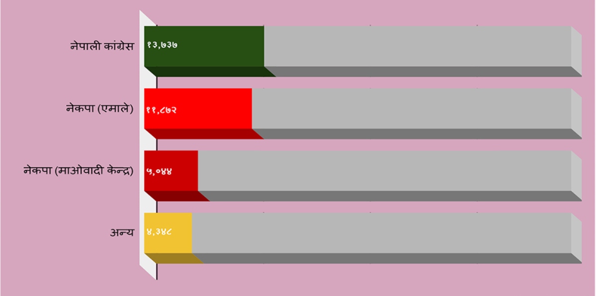 गत वैशाखमा सम्पन्न निर्वाचनमा कांग्रेसबाट १४० प्रमुख, ११० उपप्रमुख, १८८ अध्यक्ष, १९० उपाध्यक्ष, दुई हजार ६६१ वडाध्यक्ष, दुई हजार ६०० महिला सदस्य, दुई हजार ५४७ दलित महिला सदस्य र वडा सदस्य पाँच हजार ३०१ निर्वाचित भएका छन् । एमालेबाट ८२ प्रमुख, ११३ उपप्रमुख, १२३ अध्यक्ष, १२६ उपाध्यक्ष, दुई हजार १२७ वडाध्यक्ष, दुई हजार ३४० महिला सदस्य, दुई हजार २८५ दलित महिला सदस्य र चार हजार ६७६ वडा सदस्य निर्वाचित भएका छन् ।