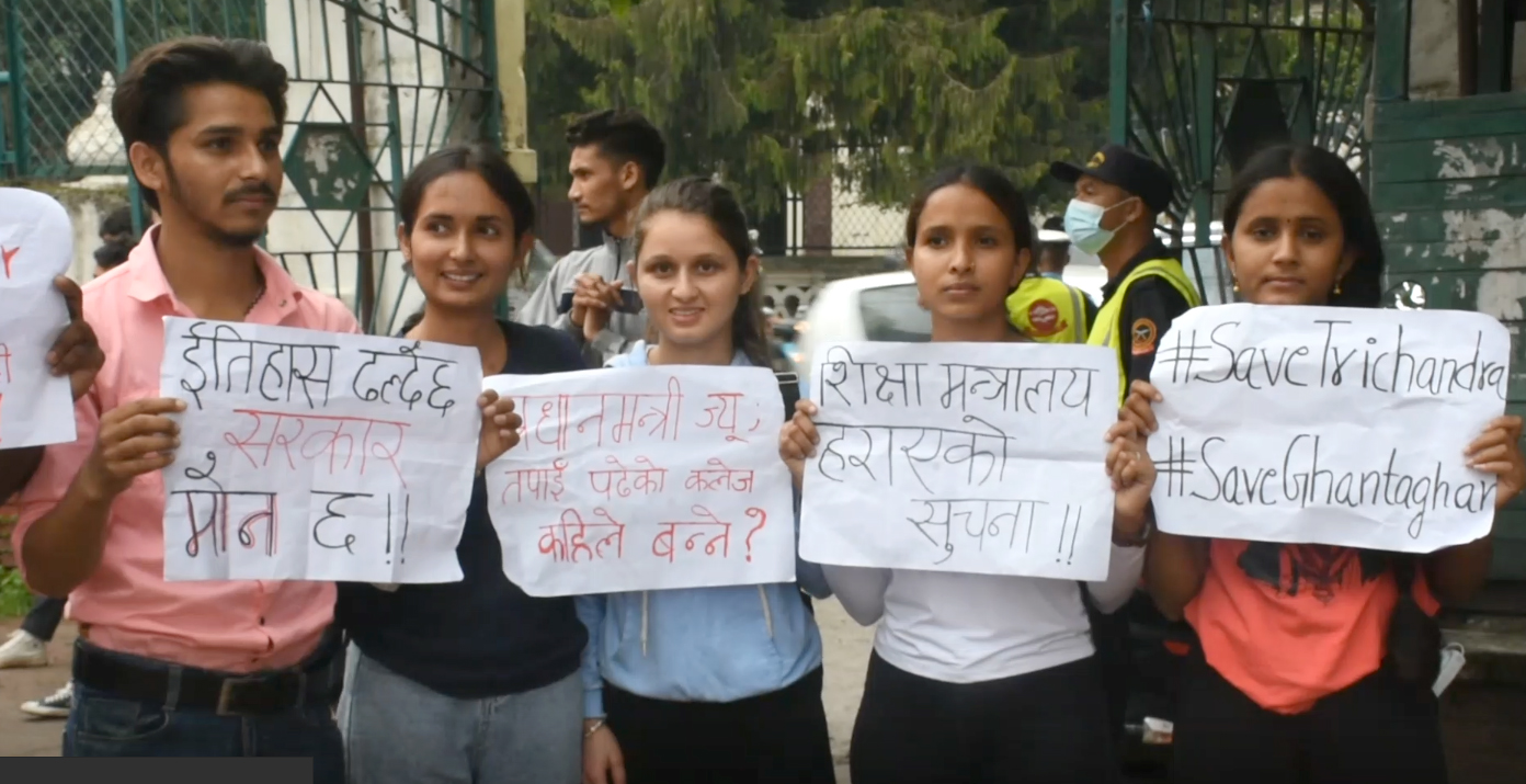 नेपालको इतिहासकै रुपमा रहेको त्रिचन्द्र क्याम्पसको पुननिर्माणमा सरकारको ध्यान नगएको भन्दै प्रदर्शन गर्नुपरेको बिद्याथीहरुको भनाई छ । एक सय चार वर्षको इतिहास बोकेको त्रिचन्द्र कलेजको अवस्था दयनीय बनेपछि विद्यार्थीहरु क्याम्पस बचाउ अभियानमा लागेका हुन् ।