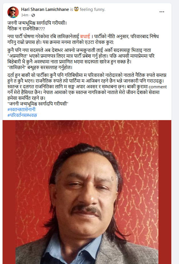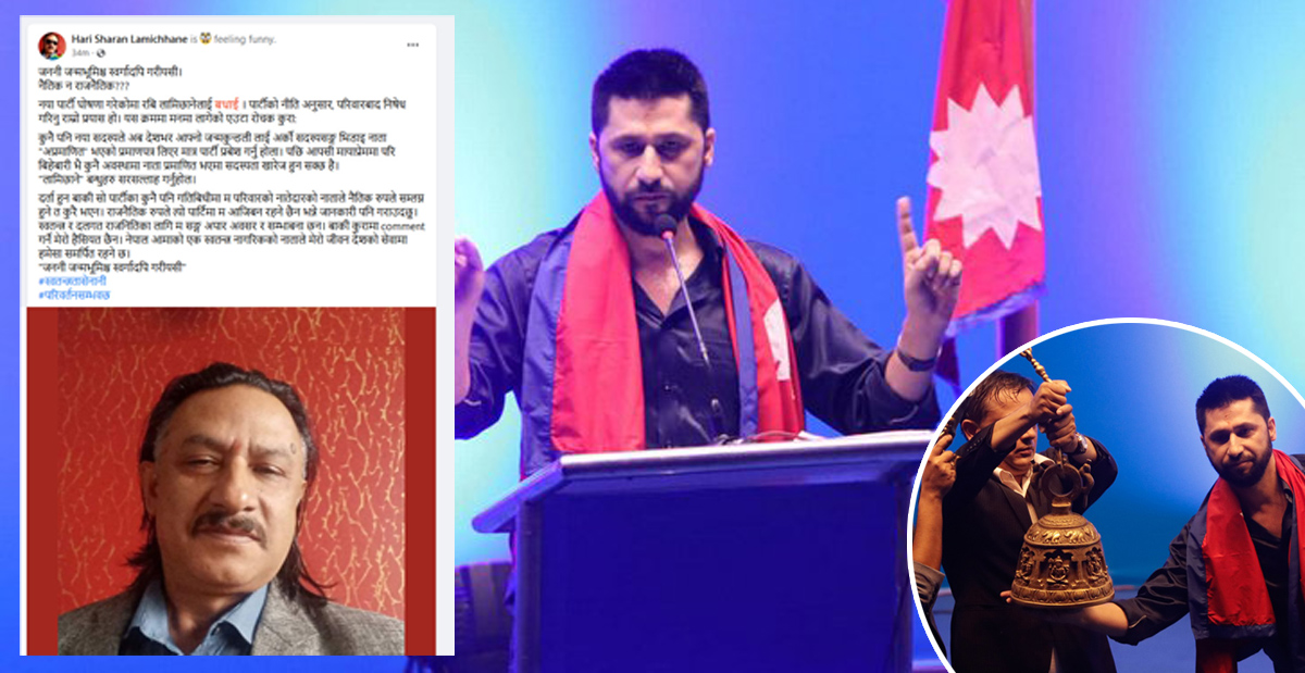 रविले घोषणा गरेको पार्टीलाई परिवारवाद निषेधप्रति उनकै दाइ हरिशरण लामिछानेले व्यांग्यात्मक शैलीमा कटु आलोचना गरेका छन् । नयाँ पार्टी घोषणा गरेकोमा रबि लामिछानेलाई बधाई दिँदै हरिशरणले पार्टीको नीति अनुसार, परिवारबाद निषेध गरिनु राम्रो प्रयास भएको व्यंग्य गरेका छन् । उनले सामाजिक सञ्जालमा मनमा लागेको एउटा रोचक कुरा भन्दै लेखेका छन् –“कुनै पनि नयाँ सदस्यले अब देशभर आफ्नो जन्मकुन्डलीलाई अर्को सदस्यसङ्ग भिडाइ नाता ‘अप्रमाणित’ भएको प्रमाणपत्र लिएर मात्र पार्टी प्रबेश गर्नु होला । पछि आपसी मायाप्रेममा परि बिहेबारी भै कुनै अवस्थामा नाता प्रमाणित भएमा सदस्यता खारेज हुन सक्छ है। ‘लामिछाने बन्धु’हरु सरसल्लाह गर्नुहोला ।
