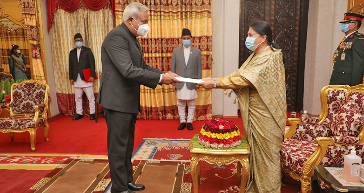 काठमाडौं । नेपालका लागि भारतीय राजदूत नवीन श्रीवास्तवले राष्ट्रपति विद्यादेवी भण्डारीसमक्ष बिहीबार ओहदाको प्रमाणपत्र पेश गरेका छन् । राष्ट्रपति भवन शितल निवासमा आयोजित विशेष समारोहमा नेपालका लागि भारतीय राजदूत श्रीवास्तवले राष्ट्रपति भण्डारीसमक्ष ओहदाको प्रमाण पत्र पेश गरेका हुन् ।