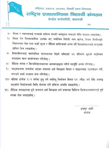 काठमाडौं । राप्रपाको भ्रातृ संगठन राष्ट्रिय प्रजातान्त्रिक विद्यार्थी संगठनले शैक्षिक क्षेत्रका समस्या समाधान गर्न ११ बुँदे माग सरकारलाई बुझाएको छ ।
