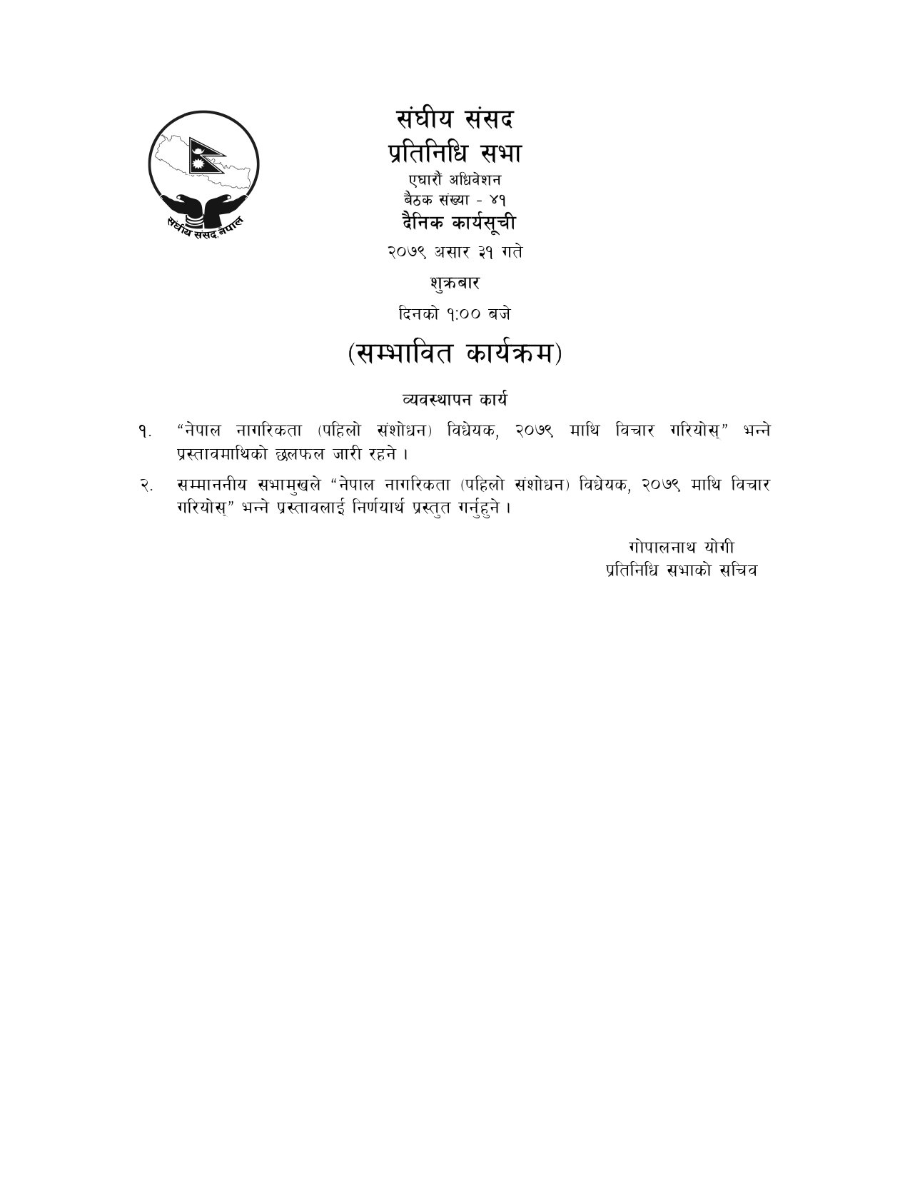 आजको बैठकमा ‘नेपाल नागरिकता (पहिलो संशोधन) विधेयक, २०७९ माथि विचार गरियोस्’ भन्ने प्रस्तावमाथिको छलफल जारी रहनेछ ।