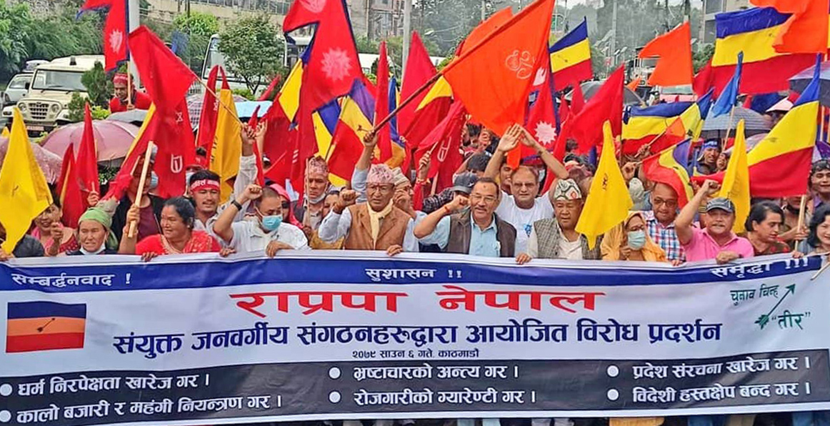 काठमाडौं । राप्रपा नेपालले प्रदेश संरचना खारेज गर्न माग गर्दै राजधानीमा प्रर्दशन गरेको छ । सो पार्टीका जनवर्गीय संगठनहरु युवक, विद्यार्थी, महिला, युवा मोर्चा, मजदुर, पूर्व प्रहरी, धार्मिक संगठन, सांस्कृतिक संगठन लगायतले प्रदेश संरचना खारेजलगायत विभिन्न माग राख्दै शुक्रबार संयुक्त रुपमा विरोध प्रदर्शन गरेका हुन् ।