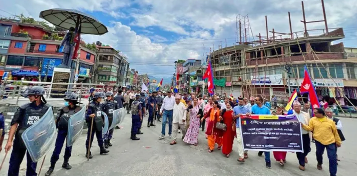 काठमाडौँ । नागरिकता विधेयक खारेजीको माग गर्दै राष्ट्रिय प्रजातन्त्र पार्टी (राप्रपा) ले पोखराको पृथ्वीचोकमा विरोध प्रदर्शन गरेको छ । नागरिकता विधेयक, एमसीसी र संघीयता खारेजीलगायत २२ बुँदे माग राख्दै राप्रपाले पृथ्वीचोकमा १० मिनेट चक्काजाम समेत गर्यो ।