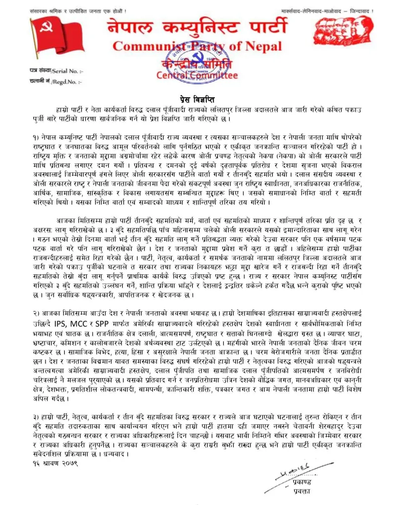 ३५ दिनभित्र अदालतमा उपस्थित हुन जनाएको ललितपुर अदालतले नेपाल कम्युनिष्ट पार्टीका नेता कार्यकर्तामाथि लागेका मुद्दाहरूमा म्याद बेपत्ते तामेल भएको भन्दै ६ साउन ०७९ को आदेशअनुसार मुलुकी फौजदारी कार्यविधि संहिता २०७४ को दफा ५८ को १३ अनुसार ३५ दिने पक्राउ पुर्जी जारी गरिएको हो ।