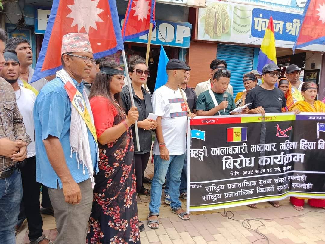 बुधबार पार्टीनिकट सबै जनवर्गीय संगठनको संयुक्त आयोजनामा कालोपट्टी बाँधेर प्रदर्शन भएको राप्रपा प्रवक्ता तथा प्रचार विभाग प्रमुख मोहन श्रेष्ठले बताए ।