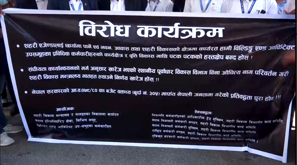 संघीयता कार्यान्वयनको मर्म अनुसार खारेज भएको बिभागलाई नाम परिवर्तन गरि मन्त्रालयमा गाभ्ने निर्णय मान्य नभएको भन्दै मन्त्रालयका इन्जिनियरिङ्ग सेवा सिभिल समुह विल्डिङ्ग एन्ड आर्किटेक्ट उपसमुहका प्राविधिक कर्मचारीहरुले मन्त्रालयमा प्रदर्शन गरेका हुन् ।