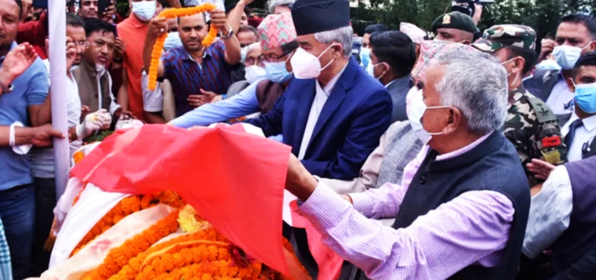सभापति देउवाले पार्टी केन्द्रीय कार्यालय सानेपामा राखिएको गिरीको पार्थिव शरीरमा पार्टीको चारतारे झण्डा ओढाएर उनीप्रति श्रद्धाञ्जली र सम्मान अर्पण गरेका हुन् ।