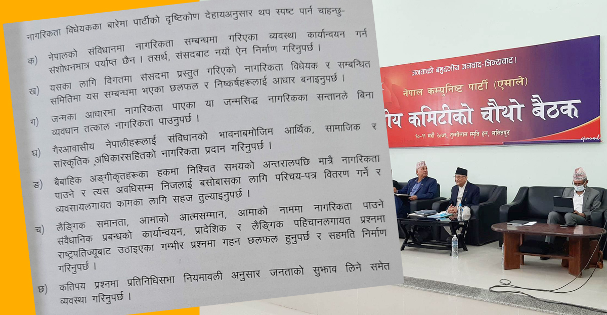 काठमाडौँ । नेकपा (एमाले)ले विवादित नागरिकता विधेयकका बारेमा सात बुँदे धारणा सार्वजनिक गरेको छ । केन्द्रीय कमिटीको चौँथो बैठकमा अध्यक्ष केपी शर्मा ओलीले राजनीतिक प्रतिवेदन प्रस्तुत गर्दै पार्टीका तर्फबाट विधेकका सम्बन्धमा सात बुँदे धारणा राखेका हुन ।