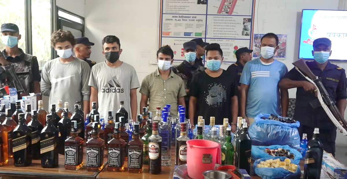 काठमाडौं । प्रहरीले नक्कली मदिरा उत्पादन गरि विक्री बितरण गर्ने गिरोहका ५ जनालाई पक्राउ गरेको छ । जिल्ला प्रहरी परिसर काठमाडौंले शुक्रबार पत्रकार सम्मेलन गर्दै बरामद भएका बिभिन्न ब्राण्डका नक्कली मदिरा सहित पक्राउ परेकाहरुलाई सार्वजनिक गरेको हो ।