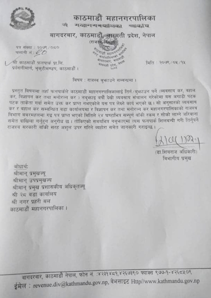 बुधबार महानगरको राजस्व विभागले फन पार्कलाई पत्राचार गर्दै २४ घण्टा भित्र व्यवसाय, बहाल, मनोरन्जन र विज्ञापन कर तिर्न अल्टिमेटम दिएको हो ।