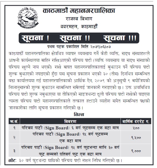 ‘काठमाडौं महानगरपालिका क्षेत्रभित्र व्यापार व्यवसाय गर्ने केही व्यक्ति, संघसंस्थाहरूले आफ्नो कार्यस्थलमा बाहिर राखिआएको परिचय पाटी (व्यक्ति व्यवसाय वा संघ संस्थाको परिचय खुल्ने नाम भएको) राखे बापत महानगरपालिकालाई बुझाउन पर्ने परिचय पाटी शुल्क बुझाएको नपाइएको हुँदा यस सूचना प्रकाशन भएको ३० (तीस) दिनभित्र सम्बन्धित वडा कार्यालयमा गई महानगरपालिकाको आर्थिक ऐन, २०७९ को अनुसूची ९ बमोजिमको निम्नानुसारको शुल्क बुझाउन सम्बन्धित सबैलाई जानकारी गराइएको छ,’ सूचनामा भनिएको छ ।