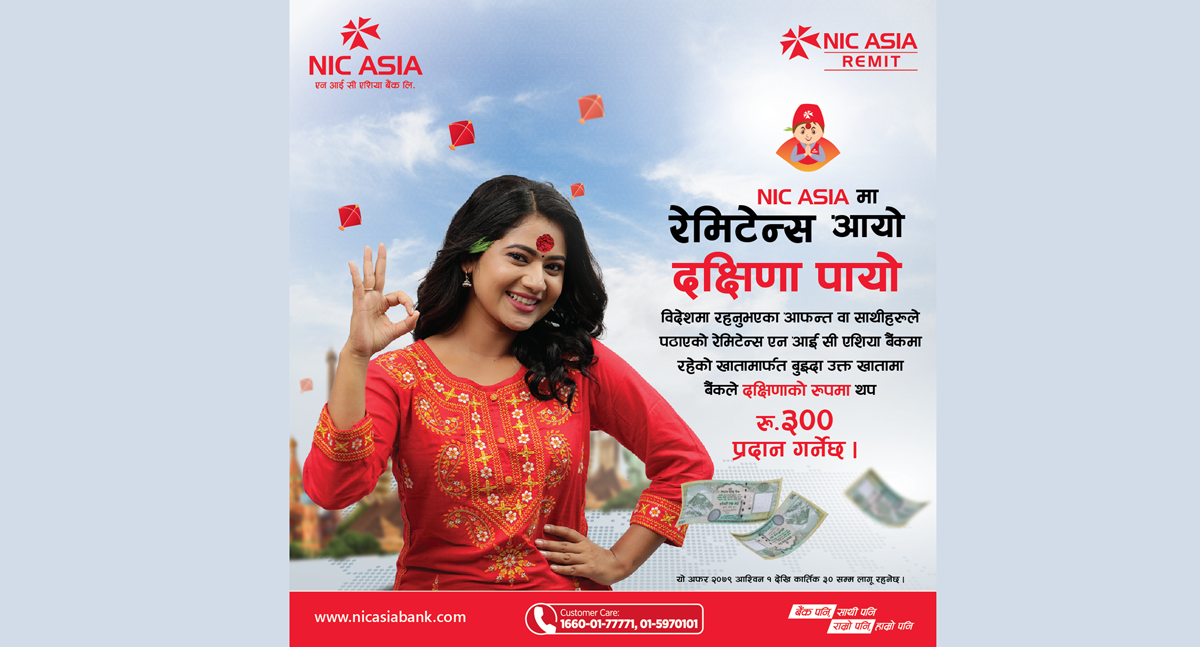 काठमाडौं । सहज एवं सबल बैंकिङ्गको मूल सिद्घान्त अनुरुप गतिशील बैंकिङ्गको अभ्यास गर्दै आएको एन आई सी एशिया बैंकले समयअनुरुप विभिन्न ग्राहकमैत्री आकर्षक योजनाहरू ल्याउने क्रममा बडा दशैं, दीपावली, नेपाल सम्बत् तथा छठ पर्वको पावन अवसरमा ‘एन आई सी एशियामा रेमिटेन्स आयो, दक्षिणा पायो’ योजना सार्वजनिक गरेको छ । एनआईसी एसिया बैंकमा रहेको खाता वा नयाँ खाता खोली रेमिटेन्स बुझ्ने ग्राहकहरूलाई आकर्षक दक्षिणाको व्यवस्था गरिएको छ । बैंकले २०७९ आश्विन १ देखि कार्तिक ३० सम्म लागू हुने गरी ल्याएको यस योजना विश्वका विभिन्न देशहरूबाट स्वदेशमा पठाएको रेमिटेन्सको हकमा लागू हुनेछ । यस योजनामा विदेशमा रहेका आफन्त वा साथीहरूले पठाएको रेमिटेन्स यस बैंकमा रहेको खातामार्फत बुझ्दा उक्त खातामा बैंकले दक्षिणाको रुपमा थप रू. ३०० प्रदान गर्ने व्यवस्था गरेको छ ।