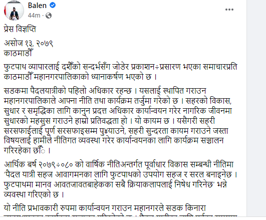 आर्थिक बर्ष २०७९/८० को वार्षिक नीतिअन्तर्गत पूर्वाधार विकास सम्बन्धी नीतिमा ‘पैदल यात्री सहज आवागमनका लागि फुटपाथको उपयोग सहज र सरल बनाइनेछ । फुटपाथमा मानव आवतजावतबाहेकका सबै क्रियाकलापलाई निषेध गरिनेछ’ भन्ने व्यवस्था गरिएको उनले विज्ञप्तिमा स्मरण गरेका छन् ।