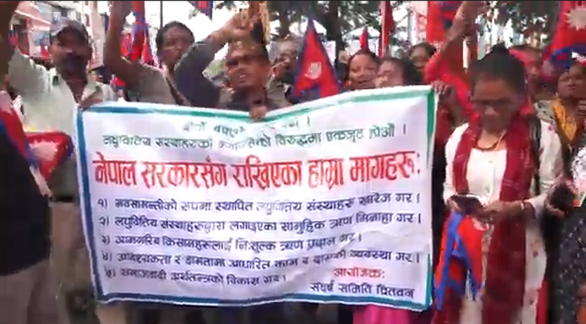काठमाडौं । लघुवित्त संस्थाहरुको खारेजीको माग गर्दै लघुवित्तिय संस्था विरुद्धको संघर्ष समितिले मंगलबार काठमाडौंमा प्रदर्शन गरेका छन् ।