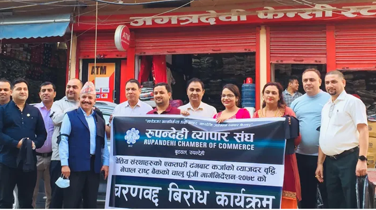 काठमाडौँ । रुपन्देही व्यापार संघले चर्को बैंक ब्याजविरुद्ध हातमा कालोपट्टी बाँधेर सांकेतिक विरोध सुरू गरेको छ । नेपाल राष्ट्र बैंकले २०७९ भदौ ७ गते इजाजतपत्रप्राप्त बैंक तथा वित्तीय संस्थाबाट प्रदान हुने चालू पुँजी प्रकृतिका कर्जा सम्बन्धमा कार्तिक १ देखि लागू हुने गरी जारी गरेको चालू पुँजी कर्जासम्बन्धी मार्गदर्शन २०७९ र त्यसबाट उत्पन्न परिस्थितिप्रति संघले आपत्ति जनाएको छ ।