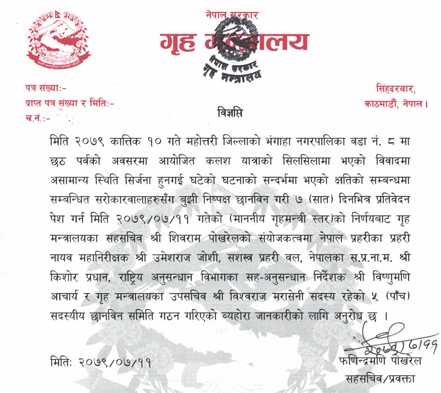 जिल्लाको भङ्गाहा नगरपालिका-८ मा छठको अवसरमा आयोजित कलस यात्राका क्रममा भएको विवादमा असामान्य स्थिति सिर्जना भई घटेको घटनाका सन्दर्भमा छानविन गर्न मन्त्रालयका सहसचिव शिवराम पोखरेलको संयोजकत्वमा पाँच सदस्यीय समिति गठन गरेको मन्त्रालयले आज एक सूचना जारी गरी जनाएको छ ।