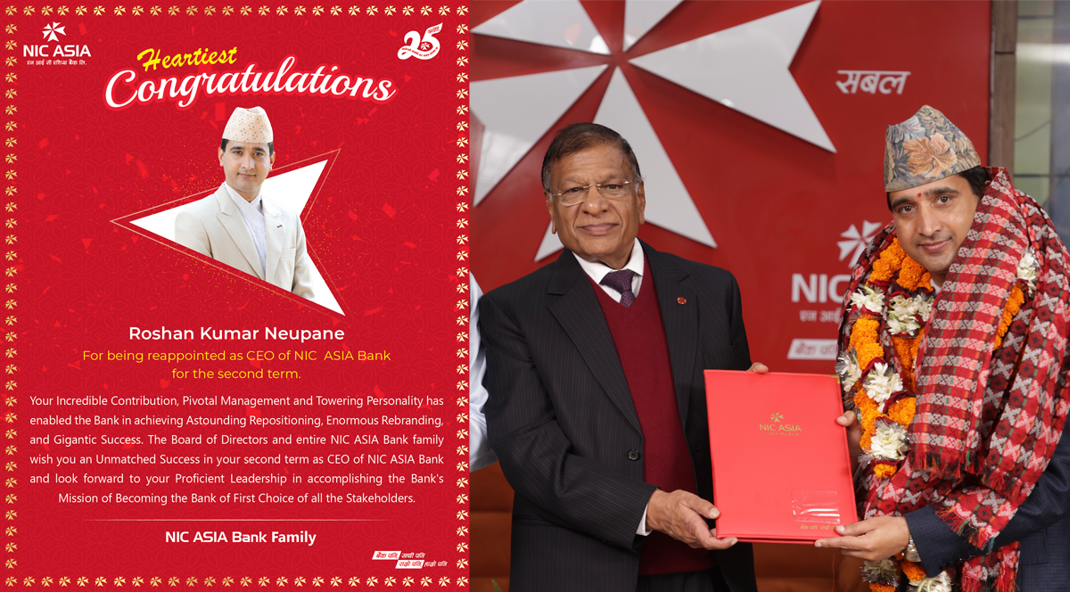 काठमाडौं । एन आई सी एशिया बैंक लिमिटेडको मिति २०७९ कात्तिक १६ मा बसेको सञ्चालक समितिको ५७३ औं बैंठकले रोशन कुमार न्यौपानेलाई बैंकको प्रमुख कार्यकारी अधिकृतमा पुर्ननियुक्त गरेको छ । हाल बैंकको प्रमुख कार्यकारी अधिकृतको रुपमा कार्यरत रहेका न्यौपानेलाई बैंकको सञ्चालक समितिले मिति २०७९ मंसिर १५ गतेदेखि लागू हुनेगरी प्रमुख कार्यकारी अधिकृतको पदमा थप ४ वर्षको अवधिको लागि पुर्ननियुक्त गर्ने निर्णय गरेको बताइएको छ ।