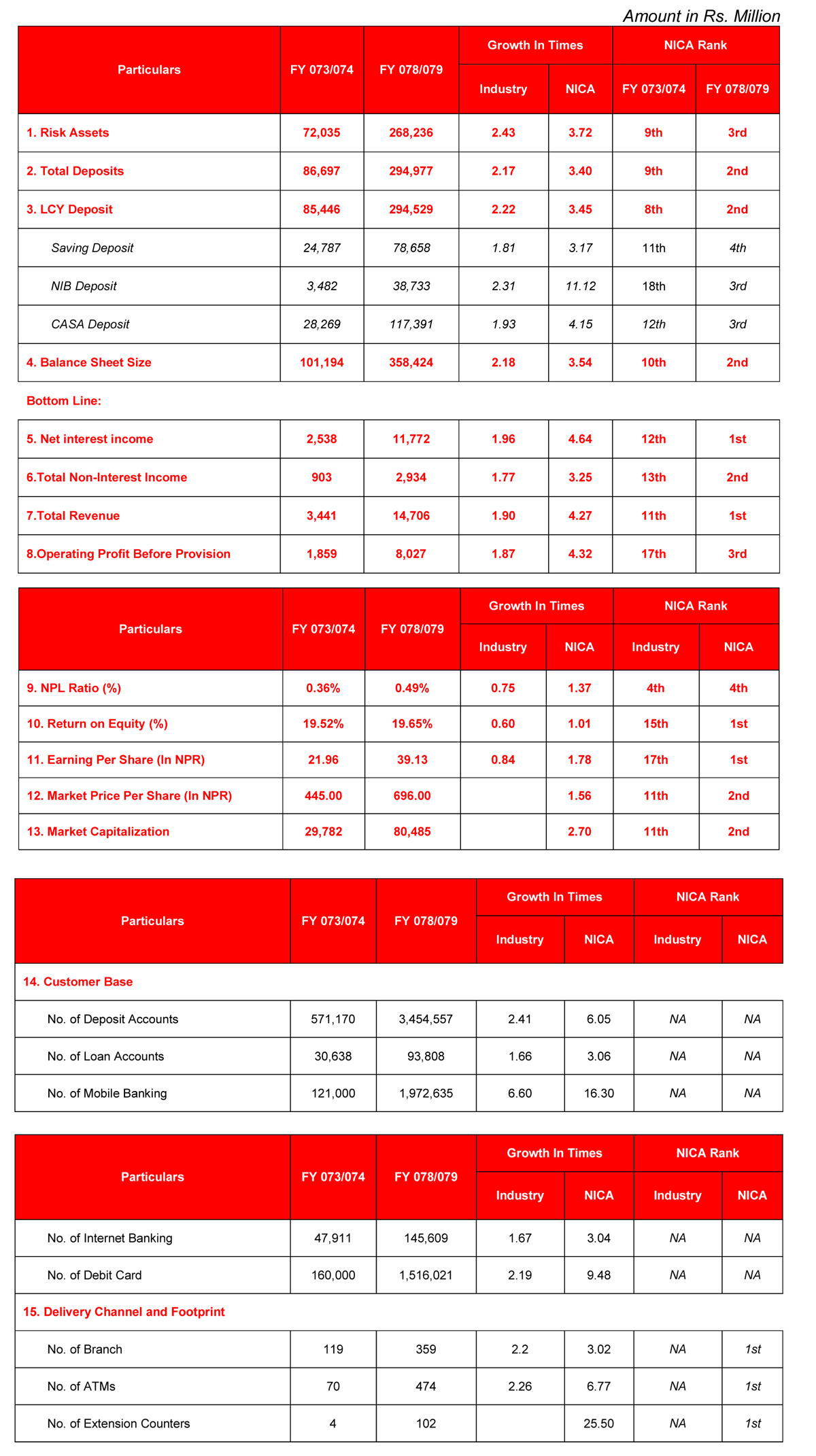 आ.व. २०७३/७४ मा १ अर्ब ८५ करोड ९० लाख रुपैयाँ रहेको संचालन नाफा गत वर्ष ८ अर्ब २ करोड ७० लाख रुपैयाँ आर्जन गर्न सफल भएको छ । यस अवधिमा समग्र बैंकिङ्ग क्षेत्रको सञ्चालन नाफा १.८७ गुणाले वृद्धि भएको थियो । यस अवधिमा स्व–पूँजीमा प्रतिफल १.०१ गुणाले वृद्धि गर्दै १९.५२ प्रतिशतबाट १९.६५ प्रतिशत, प्रति शेयर आम्दानी १.७८ गुणाले वृद्धि गर्दै २१.९६ रुपैयाँबाट ३९.१३ रुपैयाँ पुगेको छ । समग्र बैंकिङ्ग क्षेत्रको अवस्था हेर्ने हो भने यस अवधिमा स्व–पूँजीमा प्रतिफल ०.६० गुणा र प्रति शेयर आम्दानी ०.८४ गुणाले वृद्धि भएको छ । यस अवधिमा समग्र बैंकको बजार पुँजीकरण २९ अर्ब ७८ करोड रुपैयाँबाट २.७ गुणाले वृद्धि हुँदै ८० अर्ब ४८ करोड रुपैयाँ पुगेको छ ।
