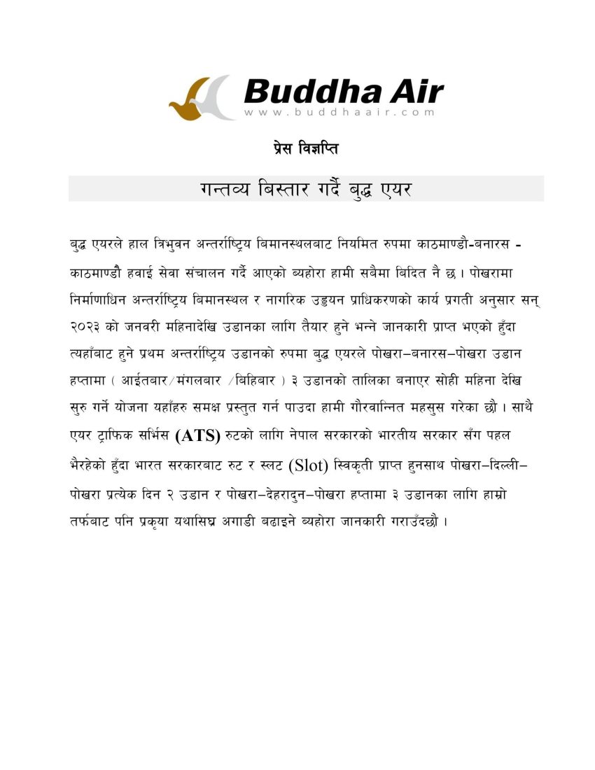 “नागरिक उड्डयन प्राधिकरणले पोखरा क्षेत्रीय अन्तर्राष्ट्रिय विमानस्थल सन् २०२३ को जनवरीदेखि सञ्चालनमा आउने जानकारी दिएको छ”, कम्पनीले भनेको छ, “त्यहाँबाट हुने पहिलो उडानका रुपमा बुद्ध एयरले पोखरा–बनारस–पोखरा उडान गर्नेछ।” पोखरा–बनारस–पोखराको उडान सातामा तीन दिन आइतबार, मङ्गलबार र बिहीबार हुने कम्पनीको भनाइ छ ।