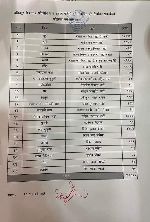 साथै, सत्ता गठबन्धनका साझा उम्मेदवार नेकपा (एकीकृत समाजवादी)का कृष्णलाल महर्जनले आठ हजार दुई सय ६४ र राष्ट्रिय प्रजातन्त्र पार्टीका उम्मेदवार रघुवरराज थापाले छ हजार छ सय ४६ मत प्राप्त गरेका छन् ।