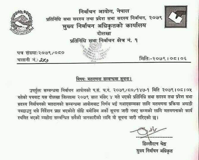 ‘दोलखा जिल्लामा २०७९ साल मंसिर ४ गते भएको प्रतिनिधि सभा सदस्य तथा प्रदेश सभा सदस्य निर्वाचनको मतदानको सम्बन्धमा आयोगबाट निर्णय भइ नआएसम्मका लागि मत गणना प्रक्रिया अगाडि नबढाउनु भन्ने निर्देशन प्राप्त भएकाले सोहीबमोजिम अर्को सूचना जारी नभएसम्मका लागि मतगणनाको कार्य स्थगित भएको व्यहोरा सम्बन्धित सबैको जानकारीका लागि यो सूचना जारी गरिएको छ,’ जिल्ला निर्वाचन कार्यालयले जारी गरेको सूचनामा उल्लेख छ ।