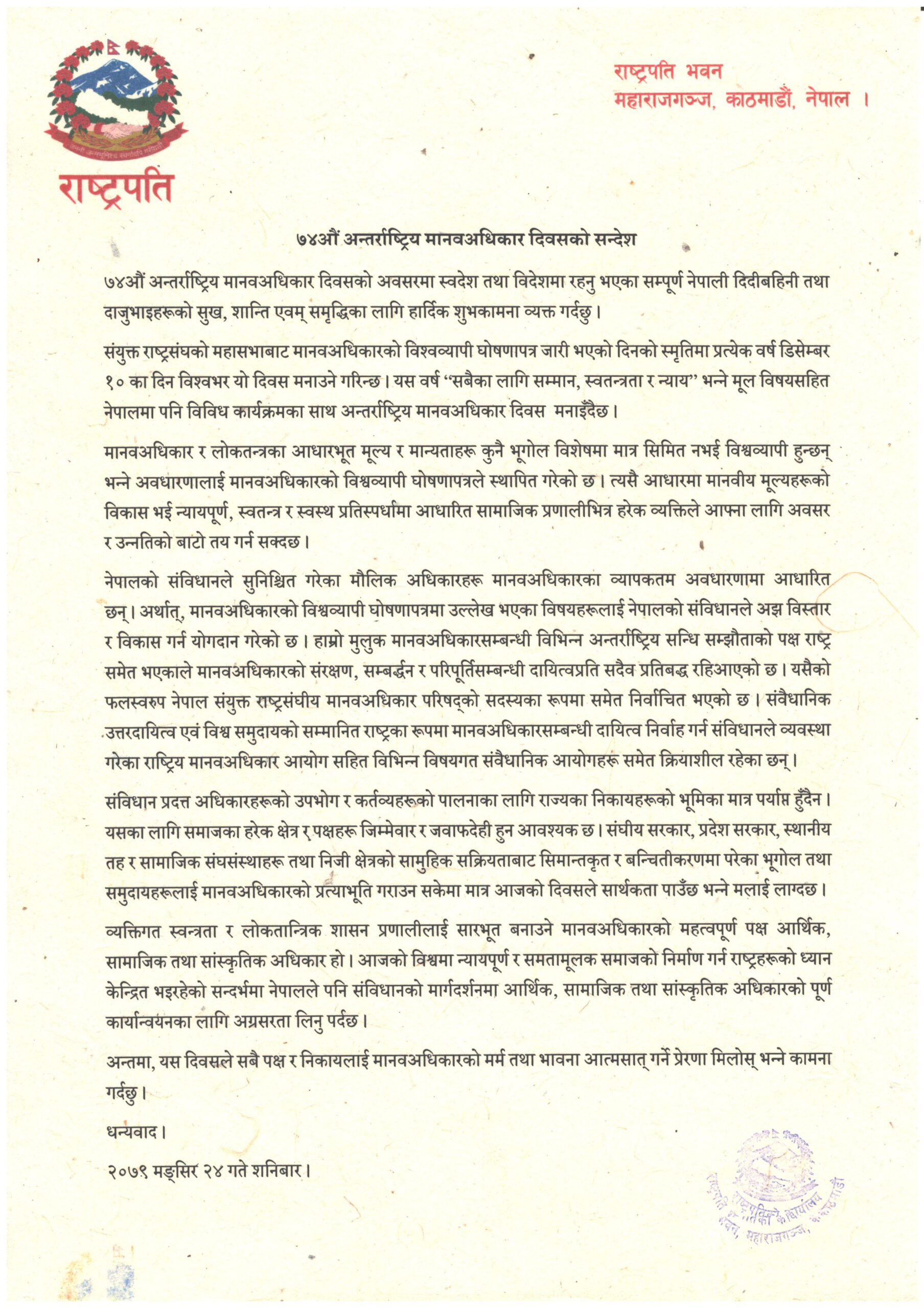 राष्ट्रपति भण्डारीले सङ्घीय सरकार, प्रदेश सरकार, स्थानीय तह र सामाजिक सङ्घसंस्थाहरू तथा निजी क्षेत्रको सामूहिक सक्रियताबाट सीमान्तकृत र बन्चितीकरणमा परेका भूगोल तथा समुदायहरूलाई मानवअधिकारको प्रत्याभूति गराउन सकेमा मात्र आजको अन्तर्राष्ट्रिय मानवअधिकार दिवसले सार्थकता पाउने बताउनुभयो ।