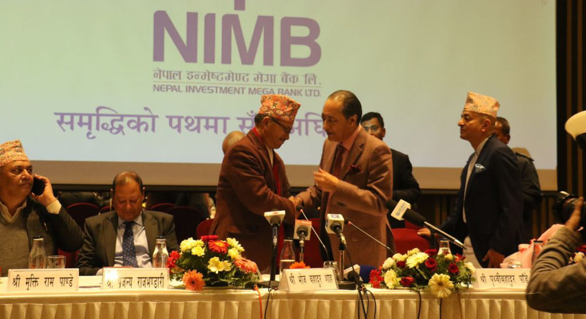 दुई बैंकले ‘नेपाल इन्भेस्टमेन्ट मेगा बैंक लिमिटेड’का नाममा एकीकृत कारोबार सुरु गरेका हुन् । बुधबार काठमाडौँमा आयोजित एक कार्यक्रममा नेपाल इन्भेष्टमेन्ट बैंकका अध्यक्ष पृथ्वीबहादुर पाँडे र मेगा बैंकका अध्यक्ष भोजबहादुर शाहले संयुक्त रुपमा एकीकृत कारोबार सुरु भएको घोषणा गरेका छन् ।