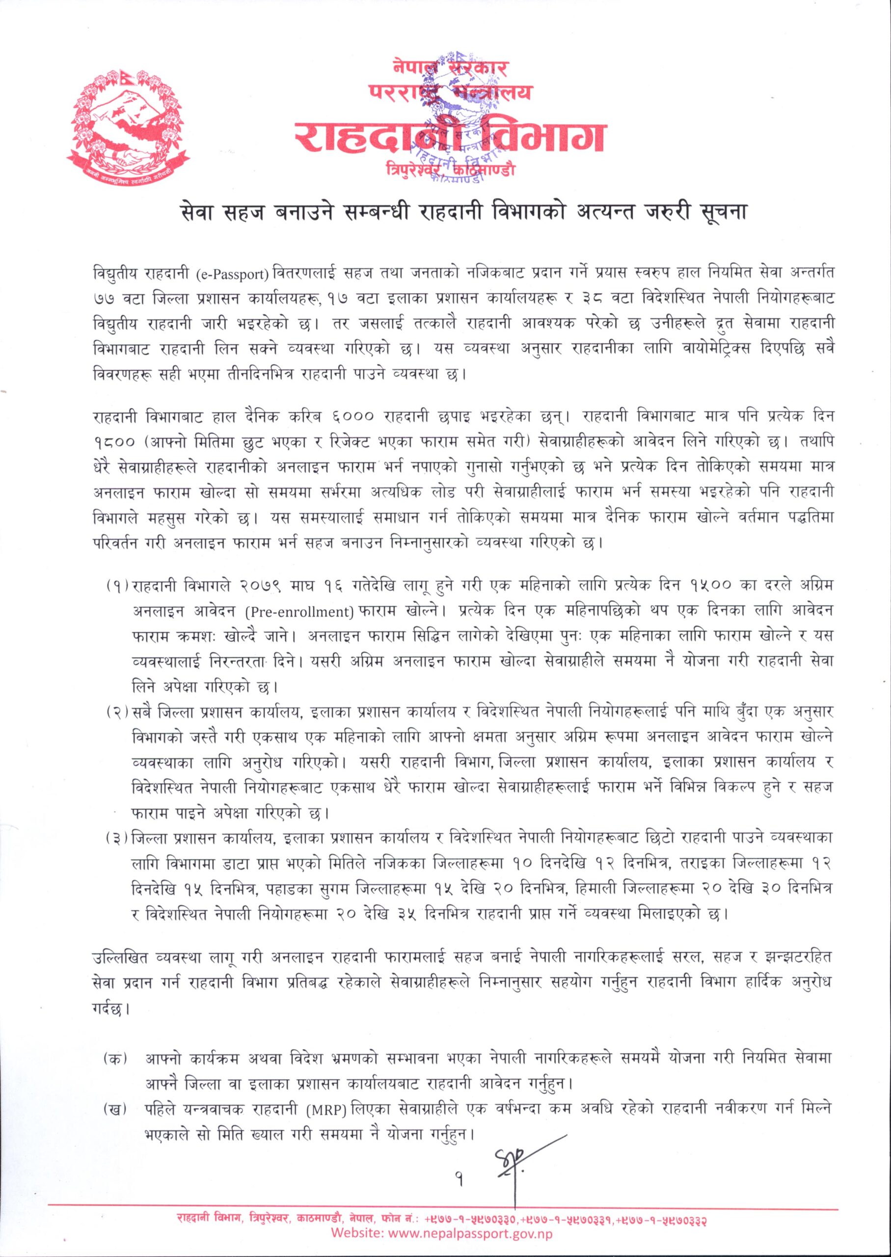 काठमाडौँ । राहदानी विभागले आफ्ना सेवा सहज बनाउने उद्देश्यले एक महिनाको अग्रिम अनलाइन आवेदन अर्थात् प्रि–इनरोलमेन्टको व्यवस्था गरेको छ ।