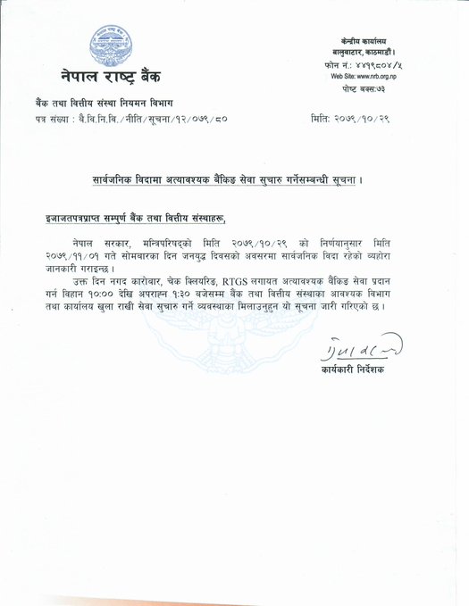 “नगद कारोबार, चेक क्लियरिङ, आरटिजिएसलगायत बैङ्किङ सेवा प्रदान गर्न बिहान ११:०० बजेदेखि अपराह्न १:०० बजेसम्म बैङ्क तथा वित्तीय संस्थाका आवश्यक विभाग तथा कार्यालय खुला राखी सेवा सुचारु गर्ने व्यवस्था मिलाउन हुन यो सूचना जारी गरिएको छ”, राष्ट्र बैङ्कले जारी गरेको विज्ञप्तिमा भनिएको छ ।