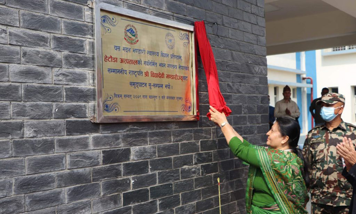 मकवानपुर । राष्ट्रपति विद्यादेवी भण्डारीले बागमती प्रदेशको राजधानी हेटौँडास्थित हेटौँडा अस्पतालको नवनिर्मित भवनको आज उद्घाटन गर्नुभएको छ । यहाँ आयोजित समारोहमा उहाँले मदन भण्डारी स्वास्थ्य विज्ञान प्रतिष्ठानअन्तर्गत रहेको उक्त भवन उद्घाटन गर्नुभएको हो ।