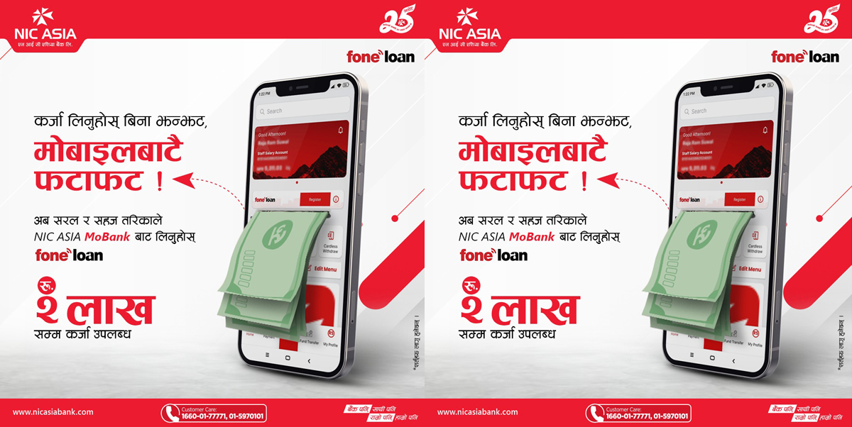 काठमाडौं । विभिन्न डिजिटल च्यानलमार्फत गतिशील बैंकिङ्गको अभ्यास गर्दै आइरहेको एन आई सी एशिया बैंकले आफ्नो मोबाइल बैंकिङ्ग (NIC ASIA MoBank) एपबाटै डिजिटल रुपमा कर्जा प्रदान गर्ने गरी NIC ASIA Foneloan सेवा शुभारम्भ गरेको छ ।