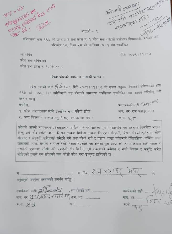 प्रस्तावमा भनिएको छ, ‘संविधानको धारा २९५ को उपधारा २ तथा प्रदेश नं. १ प्रदेश सभा (पहिलो संशोधन) नियमावली, २०७५ को परिच्छेद १०, नियम ५८ को उपनियम (ख) १ संग २९५ को उपधारा (२) बमोजिमको यस प्रदेशको नामकरण तपसिलमा उल्लेखित नाम कायम गरियोस् ।’