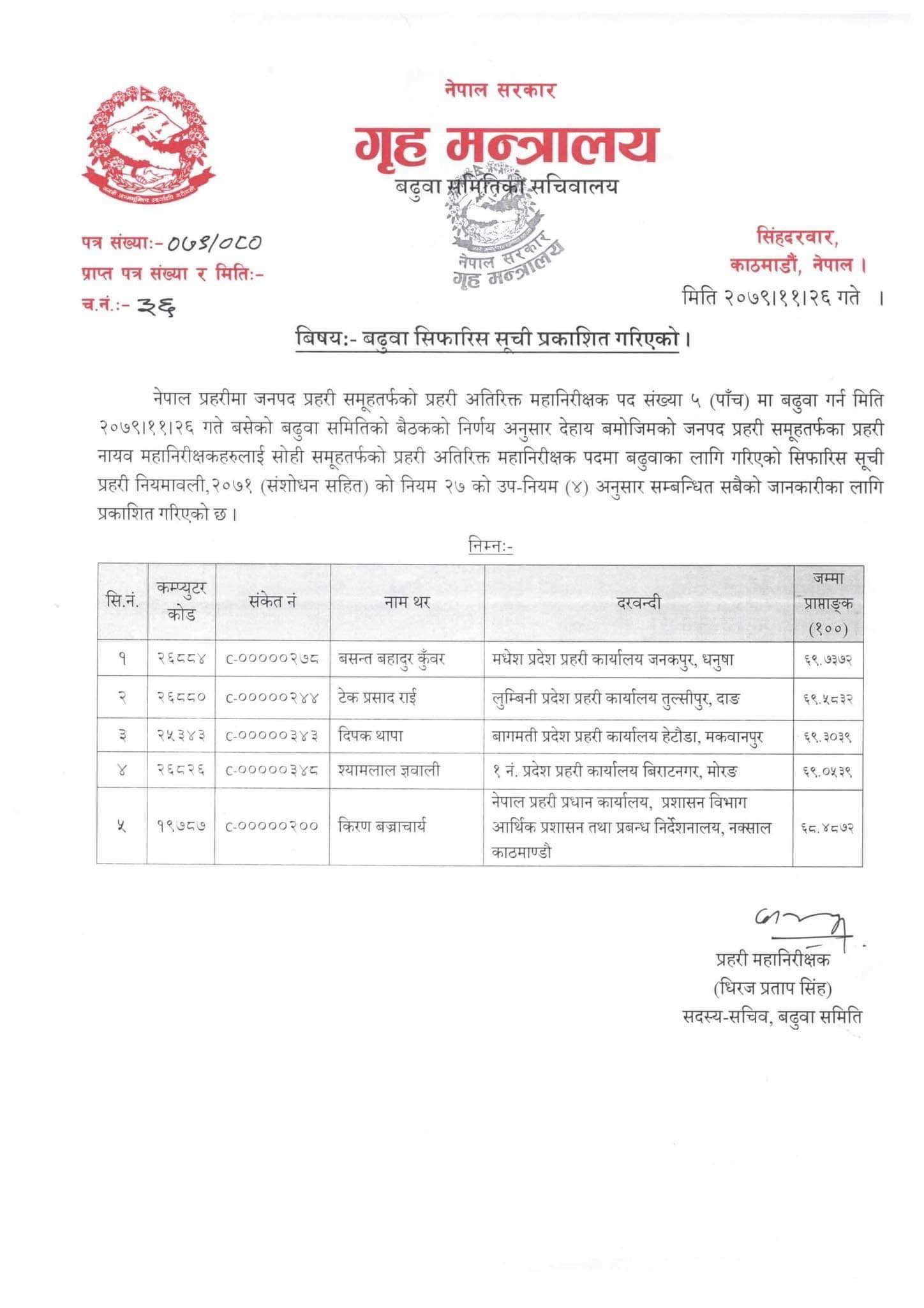 बढुवा सिफारिसको १ नम्बरमा डीआईजी वसन्तबहादुर कुँवर रहेका छन् भने दोस्रोमा टेकप्रसाद राई, तेस्रोमा दिपक थापा, चौथो श्यामलाल ज्ञवाली र पाँचौंमा किरण बज्राचार्य छन् ।
