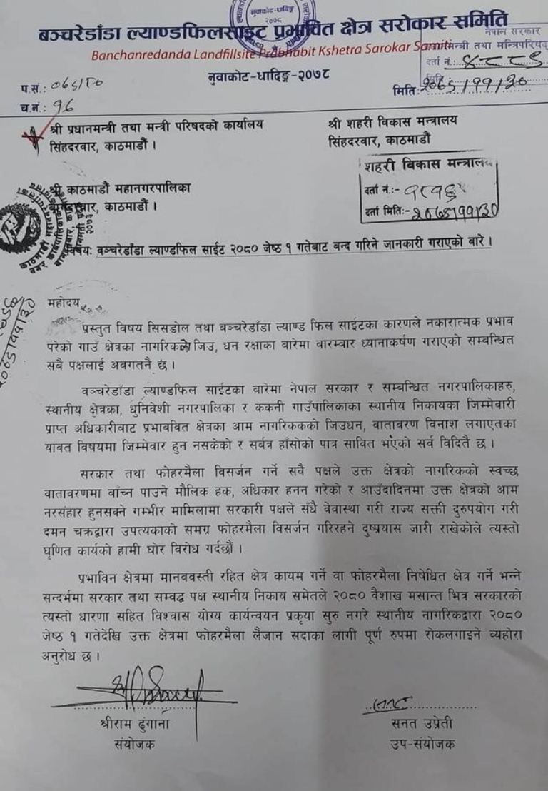 बञ्चरेडाँडा ल्यान्डफिल साइट प्रभावित क्षेत्र सरोकार समितिले बैशाखसम्म आफ्नो माग सम्बोधन नभएमा आगामी जेठदेखि फोहोर फाल्नमा रोक लगाउने चेतावनी दिएको हो ।