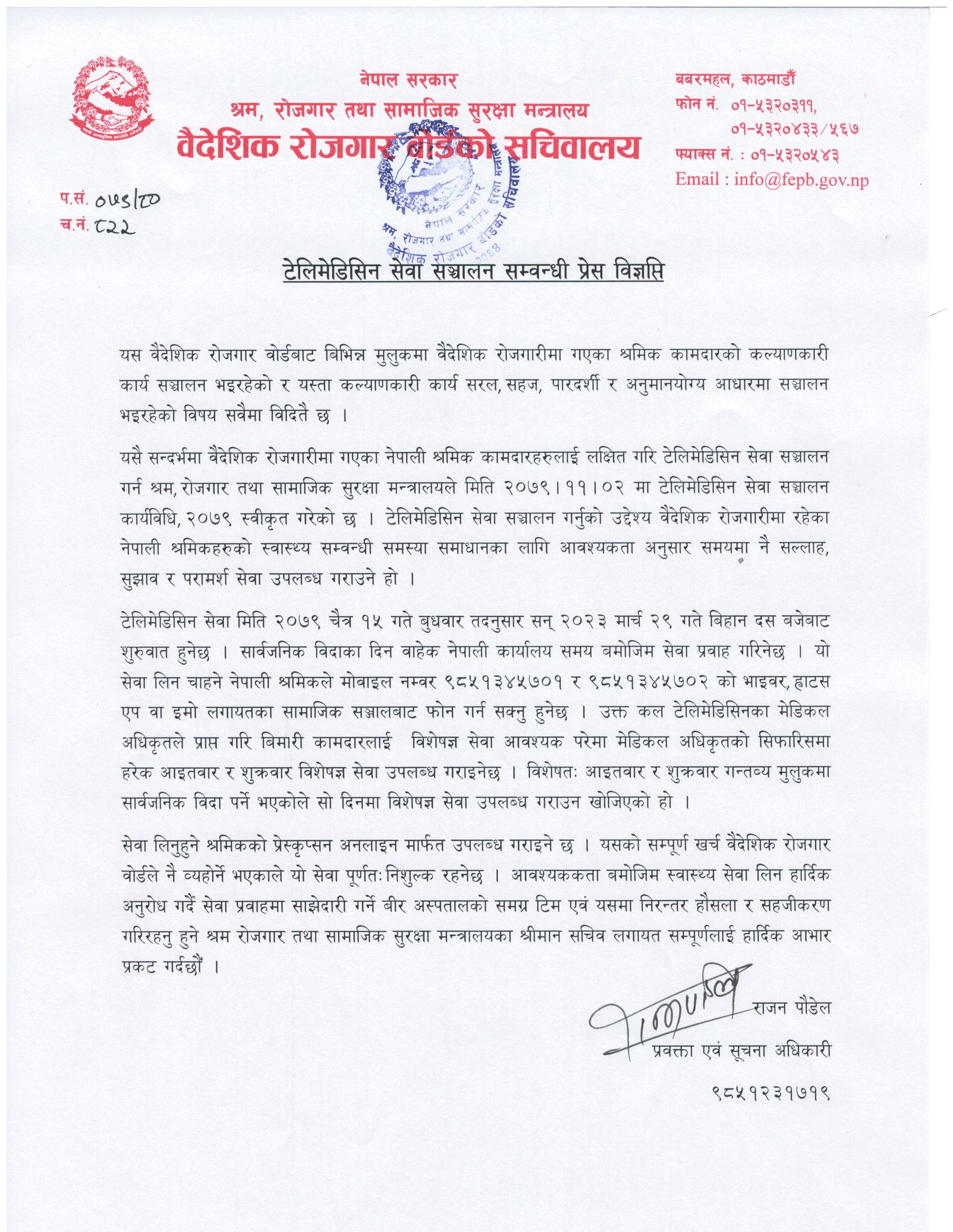 आज बिहान १०ः०० बजेदेखि सुरु हुने टेलिमेडिसिन सेवा सार्वजनिक बिदाका दिन बाहेक नेपाली कार्यालय समयमा उपलव्ध गराइने बोर्डका प्रवक्ता राजन पौडेलले जानकारी दिएका छन् । नेपाली श्रमिकले मोबाइल नम्बर ९८५१३४५७०१ र ९८५१३४५७०२ को भाइबर, ह्वाट्सएप वा इमोलगायत सामाजिक सञ्जालबाट फोन गर्न सक्नेछन् ।
