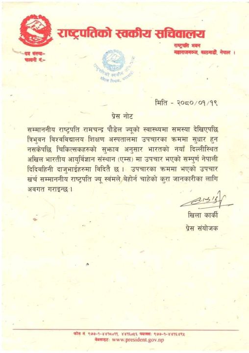 ‘उपचारको क्रममा भएको उपचार खर्च सम्मानीय राष्ट्रपतिज्यू स्वयंले बेहोर्ने कुराका जानकारीका लागि अबगत गराईन्छ,’ कार्कीले जारी गरेको बिज्ञप्तिमा भनिएको छ ।