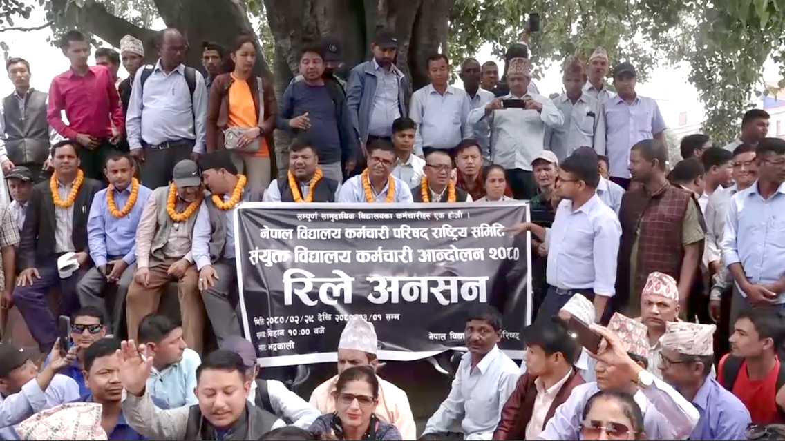 विद्यालयका कर्मचारीको न्यूनतम पारिश्रमिकको माग गर्दै आन्दोलनरत नेपाल विद्यालय कर्मचारी परिषद् संघर्ष समितिले सोमबारबाट काठमाडौंको भद्रकालीमा रिले अनसन सुरु गरेका छन् ।