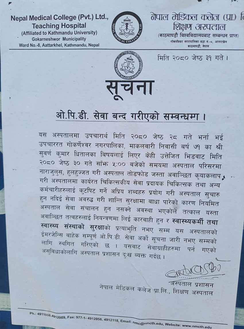 अस्पताल प्रशासनले आज एक सूचना जारी गर्दै तोडफोडमा संलग्न व्यक्तिलाई कारबाही नभएसम्म र स्वास्थ्यकर्मी तथा स्वास्थ्य संस्थाको सुरक्षाको प्रत्याभूति नभएसम्म इमर्जेन्सीबाहेक अन्य सबै सेवा बन्द गरेको जनाएको छ ।