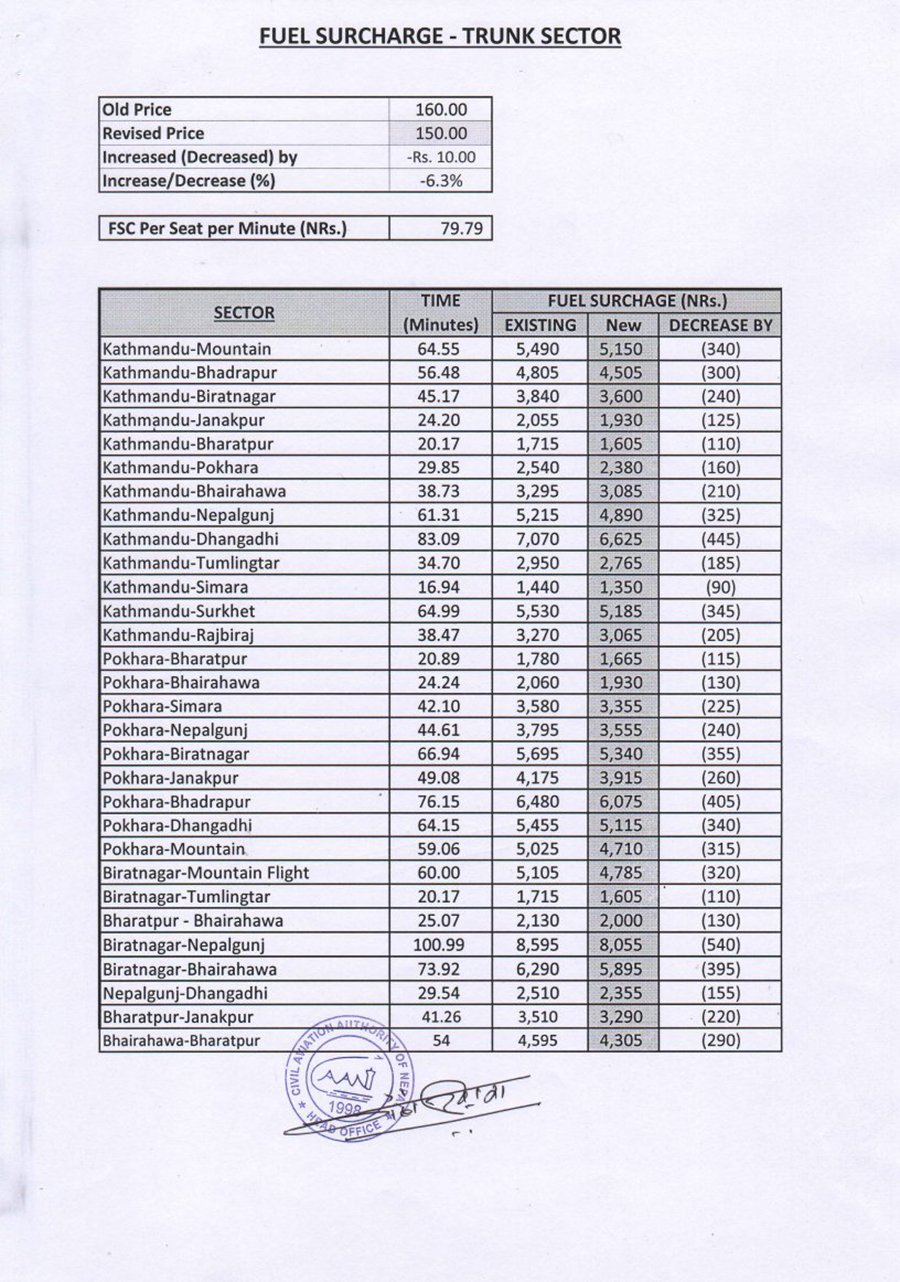 नयाँ मूल्यसूचीअनुसार सबैभन्दा कम काठमाडौं-सिमराको मूल्य १३५० रुपैयाँ तोकिएको छ। सबैभन्दा धेरै विराटनगर-नेपालगन्जको ८ हजार ५५ रुपैयाँ तोकिएको छ । यसअघि सिमराको १४४० र विराटनगर-नेपालगन्जको ८ हजार ५९५ रुपैयाँ भाडा कायम रहेको थियो ।