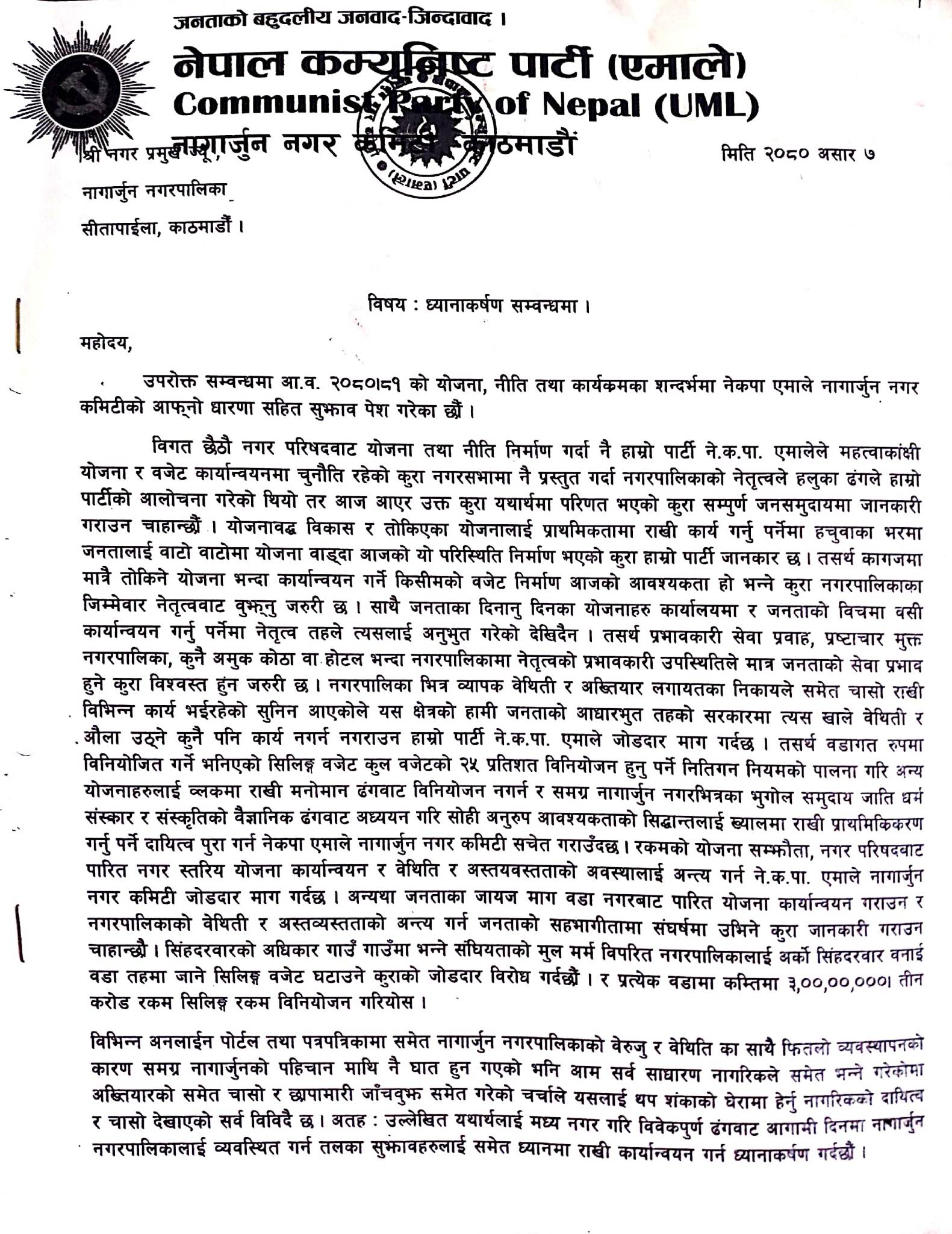 सो ध्यानाकर्षण पत्रमा नगरको समस्त विकासका साथै आसन्न नगर अधिवेशनबाट गर्नैपर्ने विकास निर्माण, स्वास्थ्य, शिक्षा,रोजगार, पर्यटन, सुरक्षा, सुशासन, कर्मचारीको ब्यवस्थापन, भ्रष्टाचार शून्य नीति, नगरबस, नगर रिङ्गरोड, खानेपानी, सडकबत्ती, स्वास्थ्य चौकी, सूचना र प्रविधिको प्रयोग (नगर एप) व्यक्तिगत घटना दर्ता, सार्बजनिक जग्गा संरक्षण, राजनीतिक दल र नगरपालिकाको समन्वय जस्ता विषय समेटिएको नगर कमिटीले जानकारी दिएको छ ।