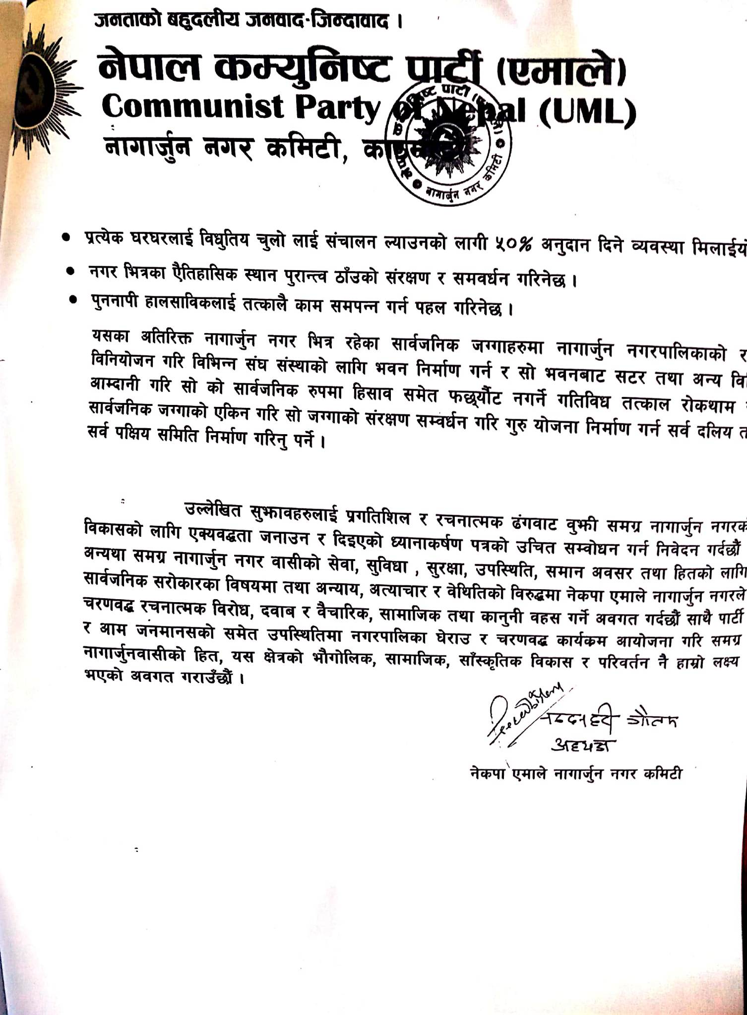 नेकपा एमाले बागमती प्रदेश कमिटी सदस्य भगवानराज घले, काठमाडौ जिल्ला कमिटी सचिवालयमा सदस्य सपना अर्याल, नागार्जुन नगर कमिटी अध्यक्ष नन्दन हरि गौतम, उपाध्यक्ष श्यामराजा गिरी, सचिव गोवर्धन केसी, नगर कमिटीका अन्य पदाधिकारीहरु, वडा कमिटी पदाधिकारी, नगरपालिकामा बसोबास गर्ने स्थानीयबासीको उपस्थितिमा सो ध्यानाकर्षण पत्र नगरप्रमुख बस्नेत समक्ष बुझाइएको हो ।